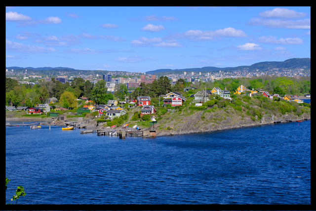 EN: Cabins on Lindøya. A4 photoprint of colourful cabins on the island of Lindøya in the Oslofjord. The cabins are used by locals as holiday homes during good weather, some can be rented by tourists. This is a framed version of the photo. Please contact us to arrange purchase and delivery.